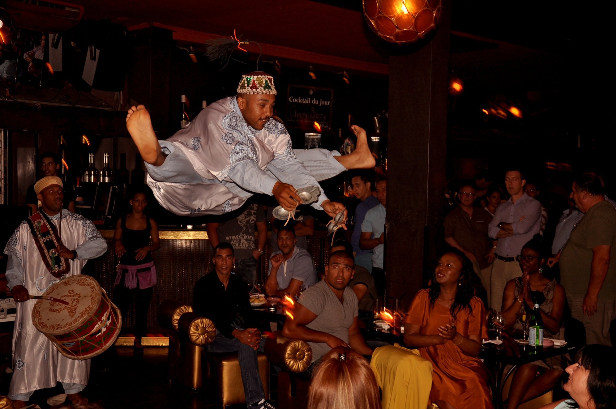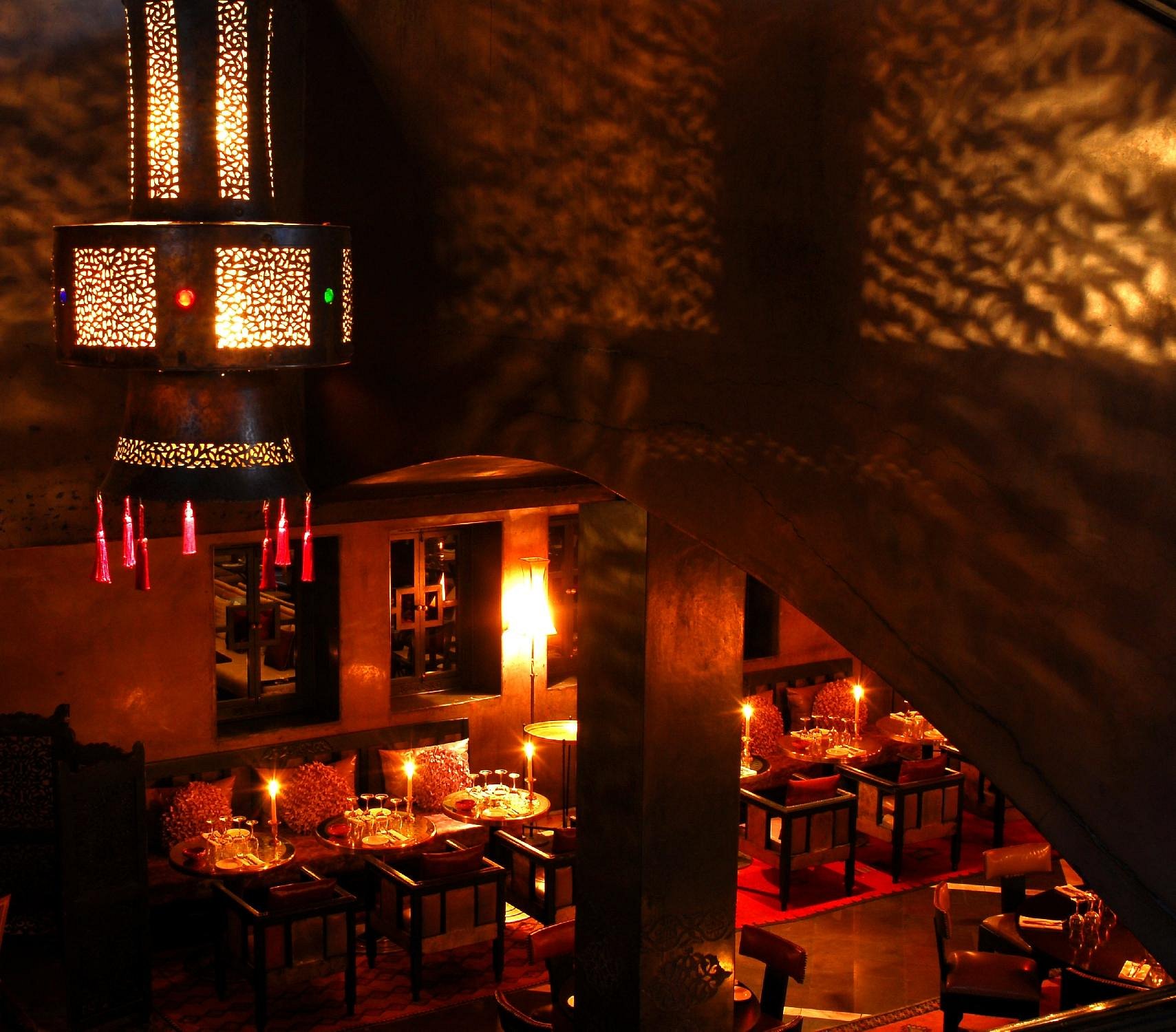 Step inside and you’re greeted by lush red interiors, candlelit tables, and the soft hum of Arabic lounge music that gradually builds into a vibrant celebration of Moroccan spirit. The setting is elegant yet inviting, with a mix of traditional design and contemporary glamour that creates a truly immersive atmosphere.